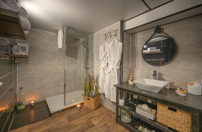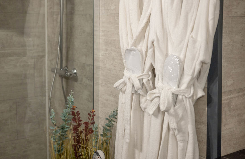 Salle de bain avec douche à l’italienne (sèche-cheveux, peignoirs, chaussons, linge de toilette et produits de toilette)
